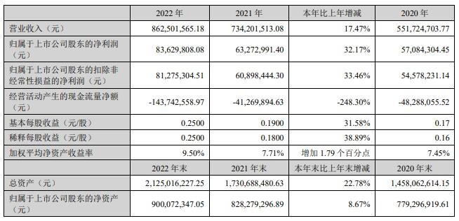 2022 年在国内宏观经济增速放缓,大宗商品原材料价格剧烈波动等不利局面下,公司管理层科学谋划企业发展思路,顶住压力,攻坚克难,实现了企业规模效益的稳步增长。报告期公司实现营业收入 86,250.16 万元,同比增长 17.47%;实现归属于上市公司股东的净利润 8,362.98 万元,同比增长 32.17%。