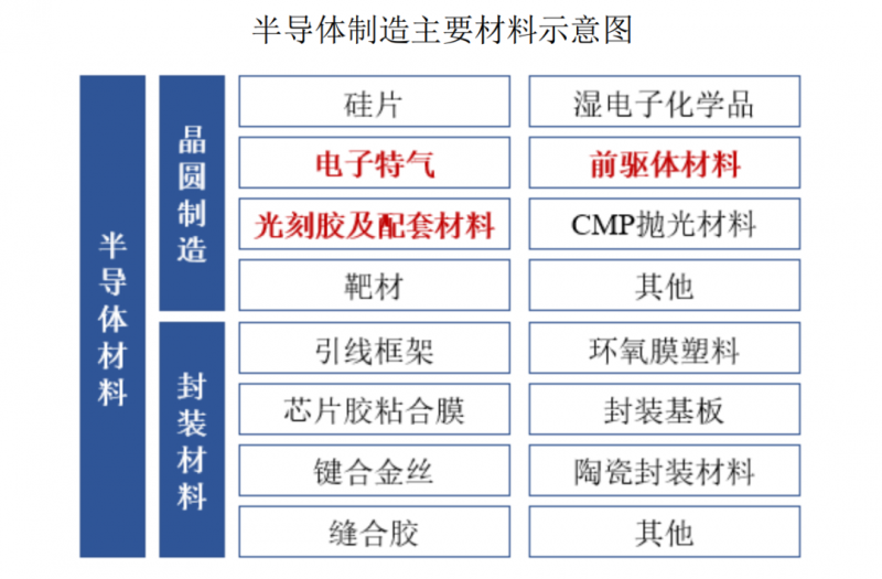 南大光电业务分为先进前驱体材料、电子特气和光刻胶及配套材料三个板块。这三类材料都是半导体晶圆制造生产过程中所必需的材料,合计占晶圆制造所需材料比重超过 1/4。