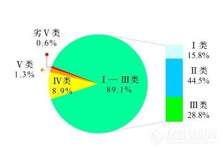 1-3月全国地表水水质类别比例。
