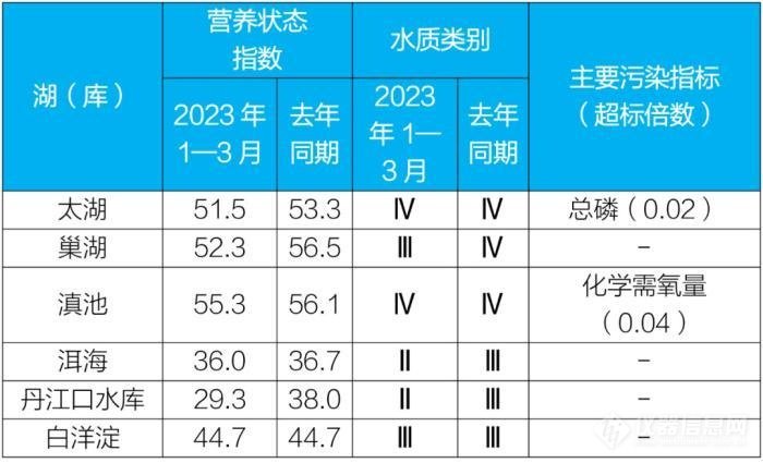 1-3月,监测的195个重点湖(库)中,水质优良(Ⅰ-Ⅲ类)湖库个数占比81.0%,同比上升2.9个百分点;劣Ⅴ类水质湖库个数占比4.6%,同比下降0.1个百分点。主要污染指标为总磷、化学需氧量和高锰酸盐指数。186个监测营养状态的湖(库)中,中度富营养的4个,占2.2%;轻度富营养的34个,占18.3%;其余湖(库)为中营养或贫营养状态。其中,太湖为轻度污染、轻度富营养,主要污染指标为总磷;巢湖水质良好、轻度富营养;滇池为轻度污染、轻度富营养,主要污染指标为化学需氧量;洱海水质为优、中营养;丹江口水库水质为优、贫营养;白洋淀水质良好、中营养。