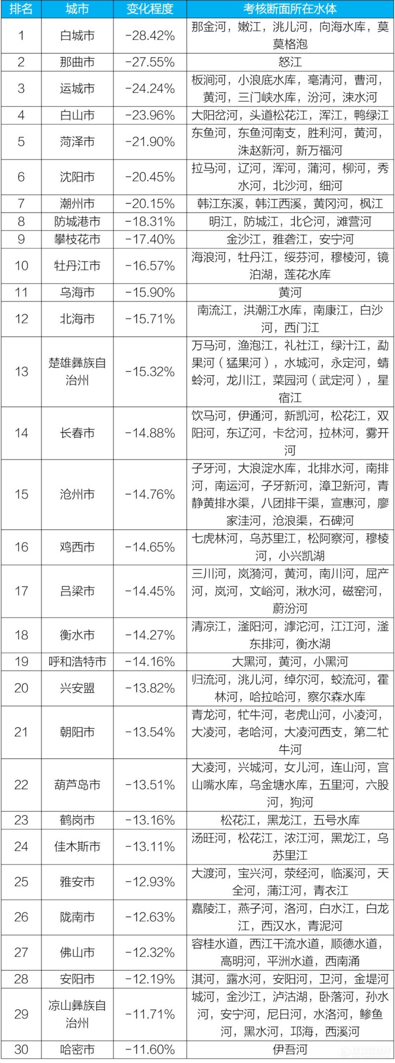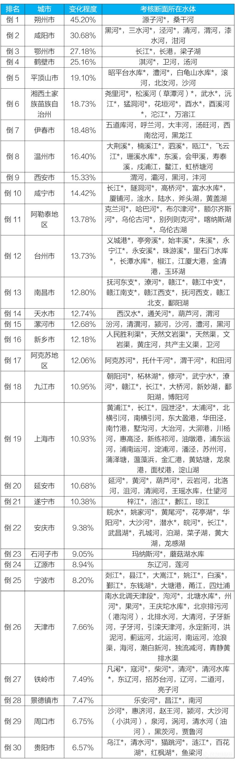 白城、那曲和运城等30个城市国家地表水考核断面水环境质量变化情况相对较好(从第1名至第30名),朔州、咸阳和鄂州等30个城市国家地表水考核断面水环境质量变化情况相对较差(从倒数第1名至倒数第30名)。