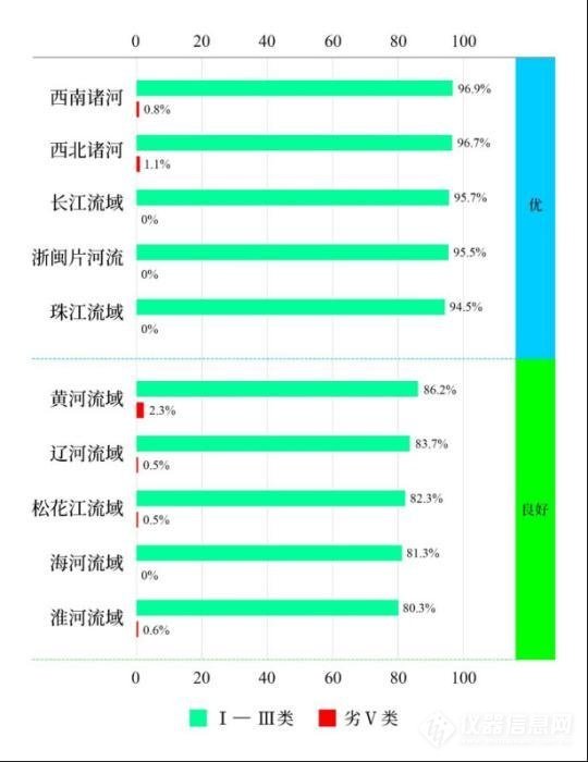 1-3月,长江、黄河、珠江、松花江、淮河、海河、辽河等七大流域及西南诸河、西北诸河和浙闽片河流水质优良(Ⅰ—Ⅲ类)断面比例为90.3%,同比上升0.6个百分点;劣Ⅴ类断面比例为0.4%,同比下降0.4个百分点。主要污染指标为化学需氧量、五日生化需氧量和氨氮。其中,西南诸河、西北诸河、长江流域、浙闽片河流和珠江流域水质为优;黄河、辽河、松花江、海河和淮河流域水质良好。