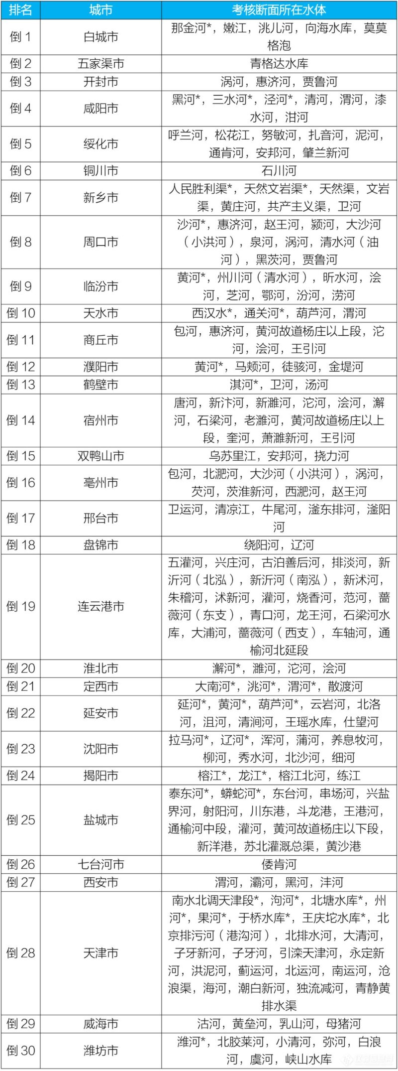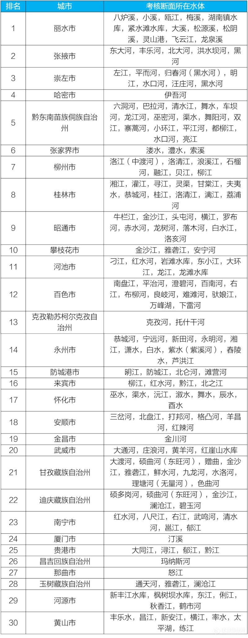 地级及以上城市国家地表水考核断面排名