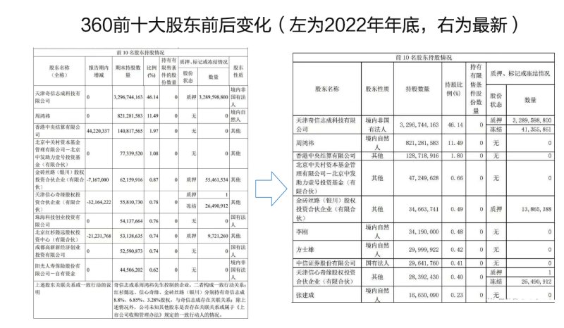 与2022年底相比,最新一季度末的最新股东结构也发生了明显变化。前十大股东中,除周鸿祎及其所控制的天津奇信志成外,其他八位均进行了减持,还有四位因大笔减持退出了前十序列。