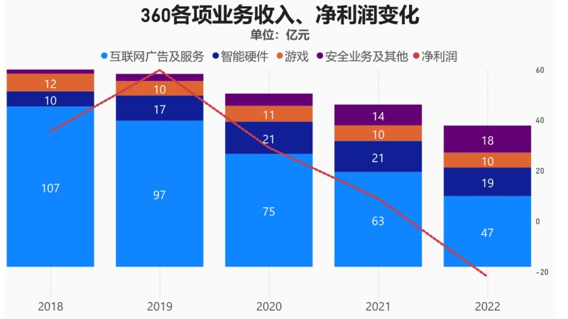2022年全年,360总营收为95.2亿元,同比下滑12.6%; 净利润亏损为22亿元,这也是公司从2018年借壳回归A股以来首次由盈转亏的历史记录。