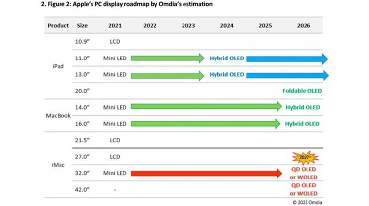 实际上,早在2022年3月,韩国媒体就报道了苹果正在开发32英寸和42英寸OLED显示屏的传闻。目前苹果已经在iPhone广泛采用OLED显示屏,明年上市的iPad Pro也将使用该面板。Omdia认为,苹果在2024年发布首款OLED iPad机型后,然后在2026年推出OLED MacBook Pro。采用QD-OLED或WOLED面板的32英寸和42英寸机型将于2027年上市,用于iMac和显示器上。不过,也有其他报告显示MacBook Air将是首款采用OLED显示屏的Mac电脑,最早可能在2024年推出。