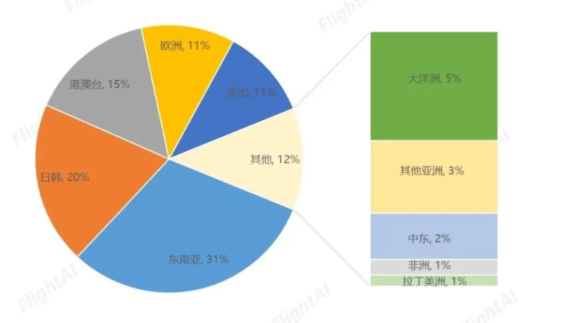 今年五一期间,出境机票搜索热度同比 2019 年同期恢复至 120%,出境游酒店搜索热度同比 2019 年恢复至约 70%。出境游目的地分布上,66% 的飞行意向集中在东南亚、日韩、港澳台亚太地区。同比 2019 年,东南亚增幅在 50% 以上。从机票数据来看,出境客源地主要来自北上广深一线城市及部分省会城市。尤其是上海,贡献了 30% 的出境订单。此外,苏州、无锡也上榜出境游前 10 客源地。