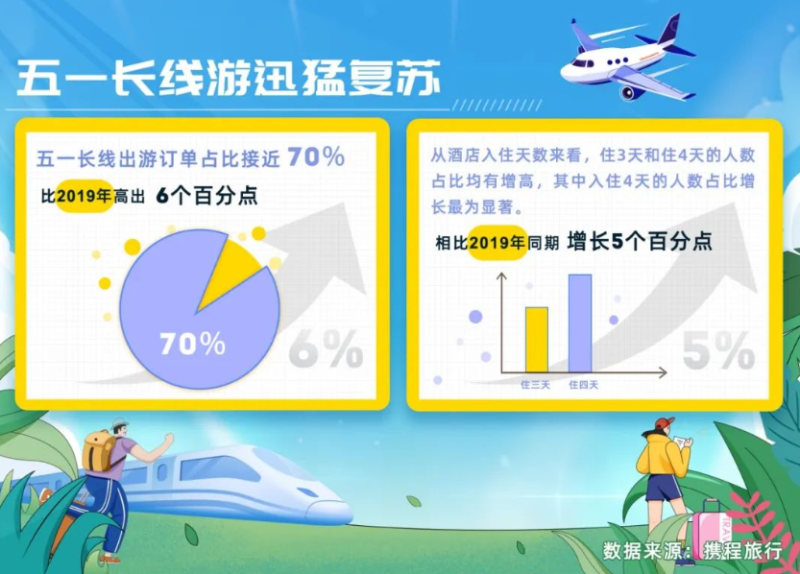 截至 4 月 19 日,五一长线出游订单占比接近 70%,相较 2019 年高出 6 个百分点。从酒店入住天数来看,住 3 天和住 4 天的人数占比均有增高,其中入住 4 天的人数占比增长最为显著,相比 2019 年同期增长 5 个百分点。