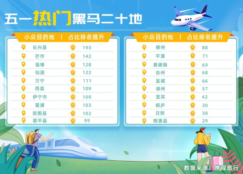 携程预测报告显示,今年劳动节五线城市旅游订单较 2019 年增长 157%。通过将今年的五一城市订单占比名次与 2019 年进行对比,报告发布了五一热门黑马二十地,分别是长兴县、芒市、淄博、仙居、万宁、西昌、伊宁市、霞浦、安图县、黎平县、柳州、平潭、景德镇、台州、盐城、漳州、宜宾、桐庐、日照和南澳县。