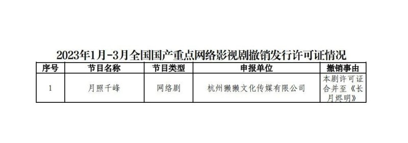 2023 年 1 月-3 月,根据制作机构申请,共撤销 1 部网络剧发行许可证。