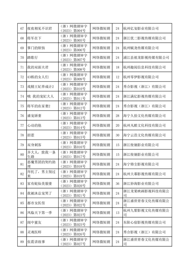 网络微短剧中,都市题材 32 部 708 集,农村题材 1 部 24 集,青少题材 1 部 24 集,公安题材 2 部 48 集,科幻题材 2 部 49 集,传记题材 3 部 69 集,传奇题材 11 部 264 集,武打题材 2 部 42 集,宫廷题材 3 部 61 集,其他题材 26 部 559 集。