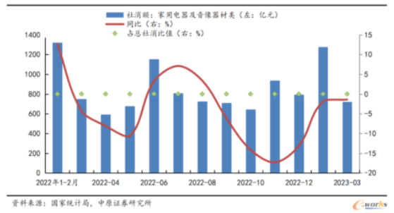 随着经济的持续复苏,消费行业市场也逐渐恢复,从国家统计局数据来看,2023年3月商品零售额为34148亿元,同比增长9.1%,其中家电及音像器材类零售额723亿元,同比下降1.4%,但占总社消比值有所提升。
