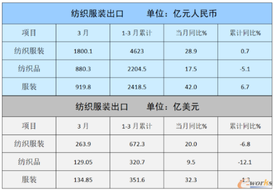 根据海关总署发布的数据,在稳外贸政策持续发力、疫情防控全面放开、春节后企业复工复产等因素影响下,3月我国纺织服装出口止跌回升,出口额超过今年2月和去年同期,出口总体趋稳。按美元计,3月纺织服装出口263.9亿美元,环比大增82%,同比增长20%。其中纺织品出口129.05亿美元,增长9.5%,服装出口134.85亿美元,增长32.3%。
