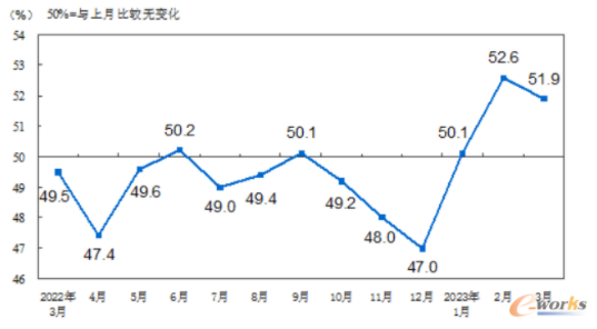 2023年3月份,制造业PMI为51.9%,受到上月高基数等因素影响,比上月下降0.7个百分点,但其景气水平仍为近两年次高点,且PMI连续三个月处于扩张区间,我国经济发展处在企稳回升之中。从分项指数看,生产指数和新订单指数分别为54.6%和53.6%,低于上月2.1和0.5个百分点,但仍位于近期较高景气水平;企业采购量指数为53.5%,是2020年12月份以来高点;生产经营活动预期指数为55.5%,持续处于高景气区间。此外,各规模企业的PMI均高于临界点,大、中、小型企业PMI分别为53.6%、50.3%、50.4%,低于上月0.1、1.7和8.0个百分点。随着第一季度的结束,整体经济虽在回升,但行业的整体回升仍面临压力。