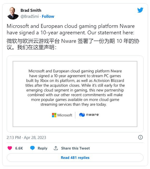微软总裁布拉德・史密斯(Brad Smith)在推文中还强调,在完成收购动视暴雪之后,后者的相关游戏也会引入到 Nware 平台。