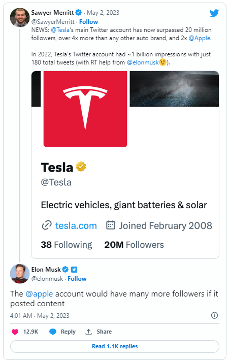 马斯克是在回应电动汽车分析师索耶・梅里特(Sawyer Merrit)的一条推文时发表这一言论的。梅里特指出,特斯拉的主推特账号现在已经有超过 2000 万粉丝,这是其他任何汽车品牌的四倍,也是苹果的两倍。梅里特说,去年特斯拉的推特账号只发了 180 条推文,但却获得了近 10 亿次的浏览量。不过分析师也注意到,这个账号得到了马斯克转发的帮助。