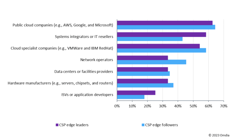 图1:CSP边缘计算领导者和跟随者在被问及价值链中哪些参与者将获得边缘计算机会的最大份额时的回答。注:N=108。资料来源:Omdia。
