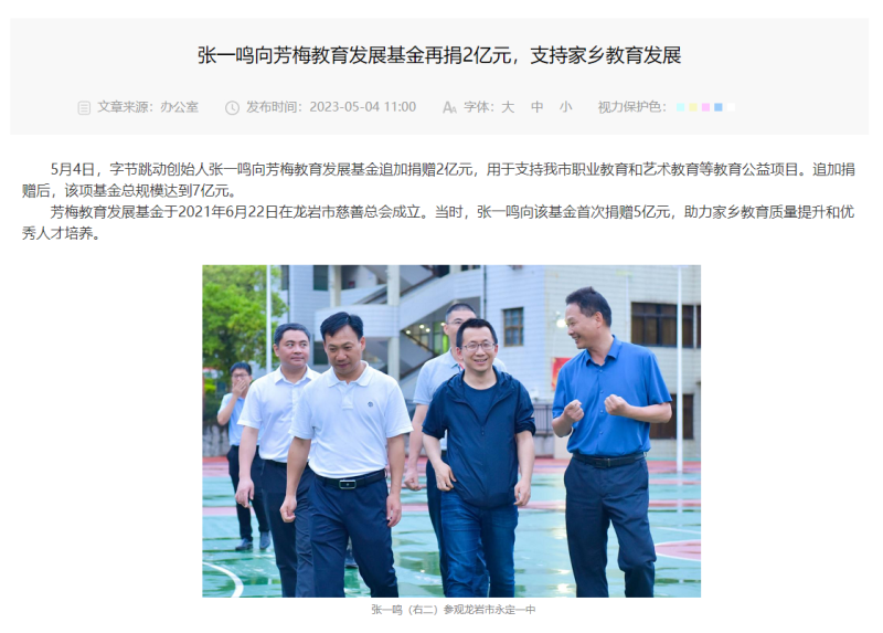 IT之家 5 月 4 日消息,IT之家从龙岩市教育局官网获悉,字节跳动创始人张一鸣向芳梅教育发展基金追加捐赠 2 亿元,用于支持龙岩市职业教育和艺术教育等教育公益项目。追加捐赠后,该项基金总规模达到 7 亿元。