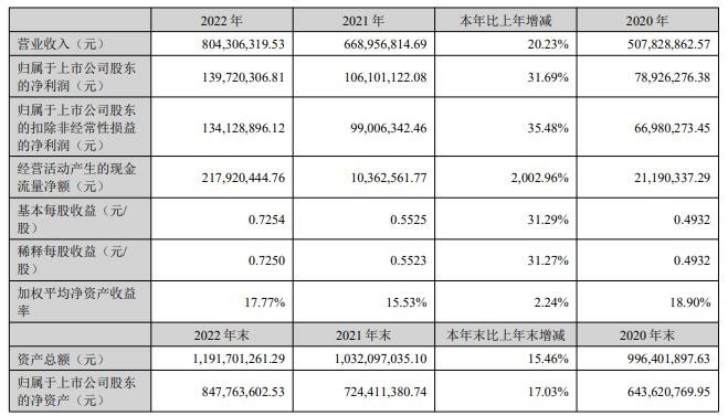 【仪表网 行业财报】4月24日,迦南智能(300880)发布2022年度报告,报告期内公司实现营业收入804,306,319.53元,同比增长20.23%;归属于上市公司股东的净利润139,720,306.81元,同比增长31.69%。