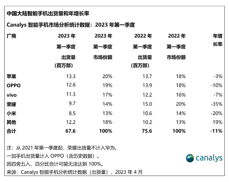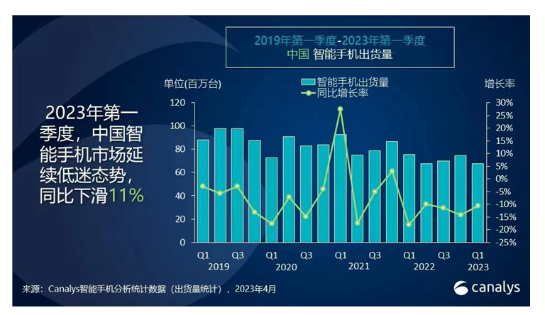 4月27日,市场研究机构Canalys发布的报告数据显示,2023年第一季度中国大陆智能手机市场出货量降低至6760万台,同比下滑11%,是自2013年以来最低的第一季度。