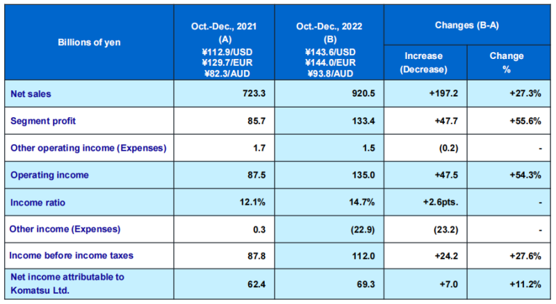 2022年10-12月(2022财年第三季度)小松合并经营业绩