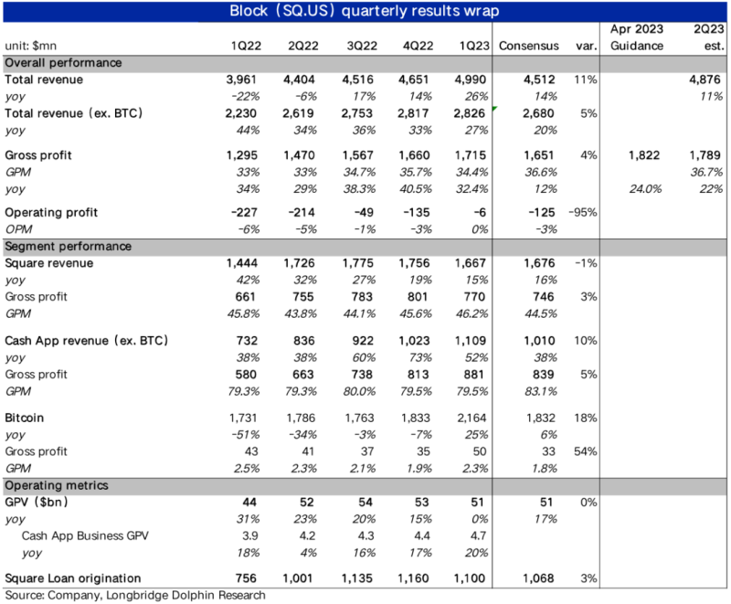 北京时间5月5日早间,数字支付公司Block(SQ.US)公布了2023年一季度财报,整体来看实际表现比市场保守的预期更好,但也缺乏吸人眼球的亮点,要点如下: