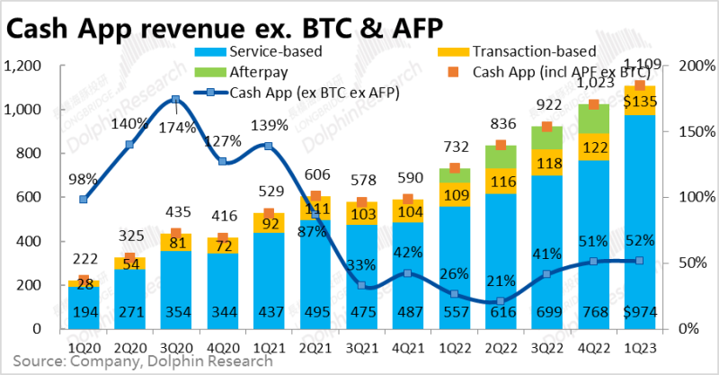 1、基于Cash App 内C2B支付的手续费收入为1.35亿元,同比增长23%,明显高出B端Square增速。