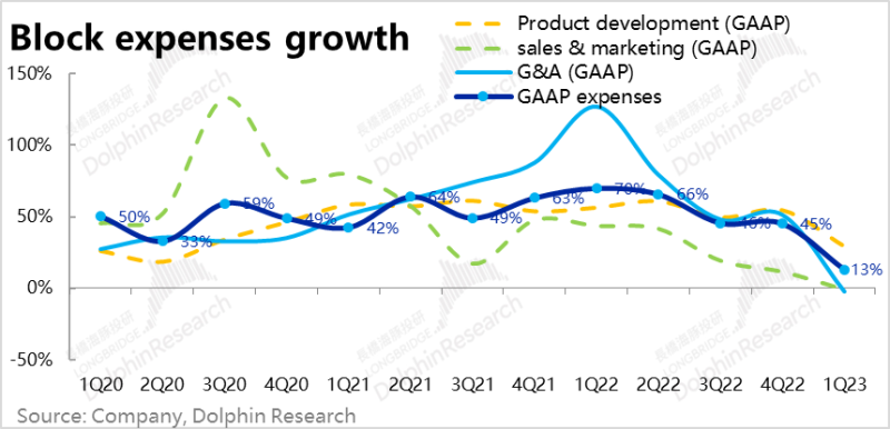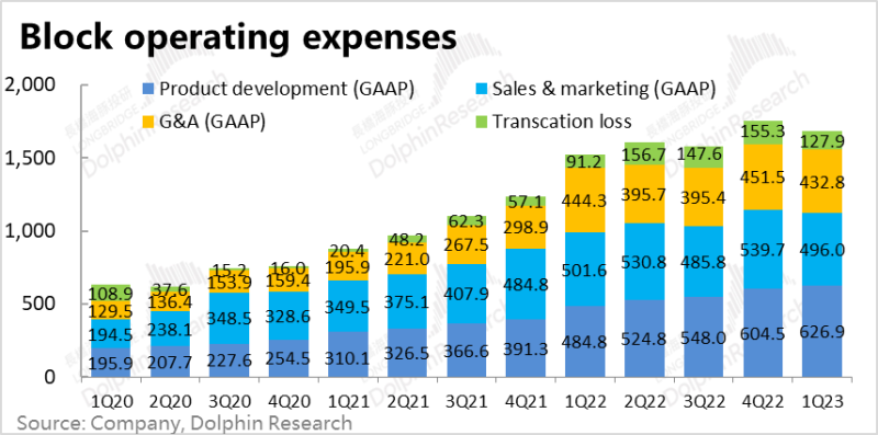 4、利润释放全看控费:在总营收(ex. BTC)同比增长27%,总毛利同比增长32%的情况下,公司本季总经营费用为17.2亿美元,同比增速大幅滑落到近13%,可见本季度Block又开始控费。细分来看,除了研发费用投入还保持着29%的增速外,营销和内部管理费用都已同比负增长。