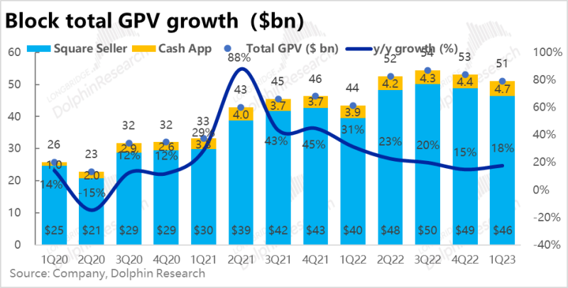 而影响手续费收入,Square板块内实现的支付金额 (GPV) 为460亿美元,同比增长了17%,环比下降了30亿,规模自3Q22以来持续走低。但考虑到美国经济增长放缓,包括Cash App在内的整体GPV为510亿,和市场预期一致。