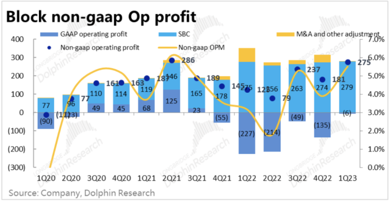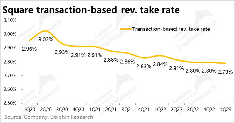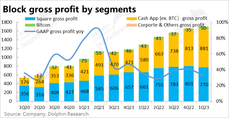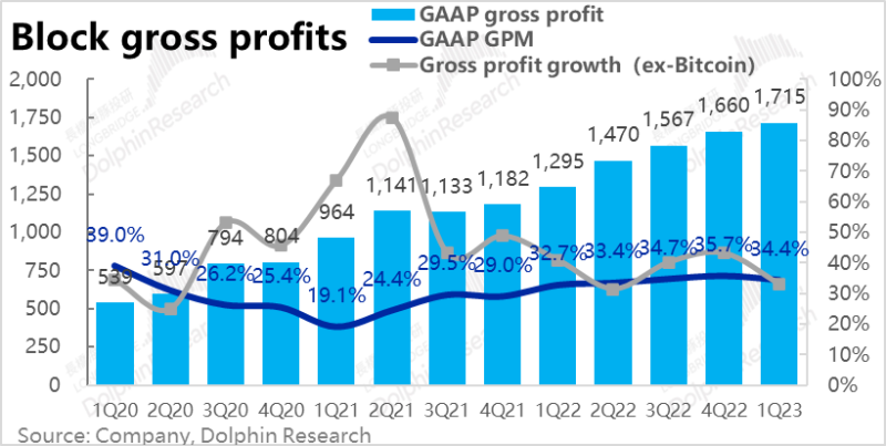 从公司更关注的毛利角度,本季Block整体实现毛利润17.2亿美元,在较低的基数下同比增长了超32%,毛利率环比略有回落到34.4%,接近2022年的毛利率中枢。