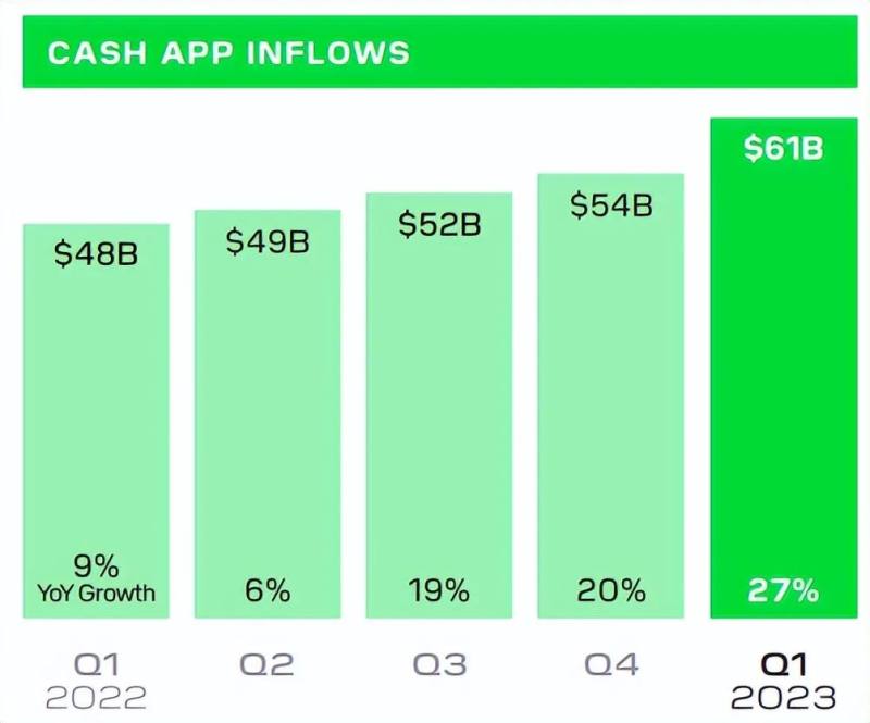 另外,Cash App在向用户的全功能金融&支付工具的转型当中,能够获得用户多少的资金量是至关重要的一点。而更加公司披露,一季度内Cash App共流入资金610亿美元,同比增速达27%,是22年以单季最高的增速。