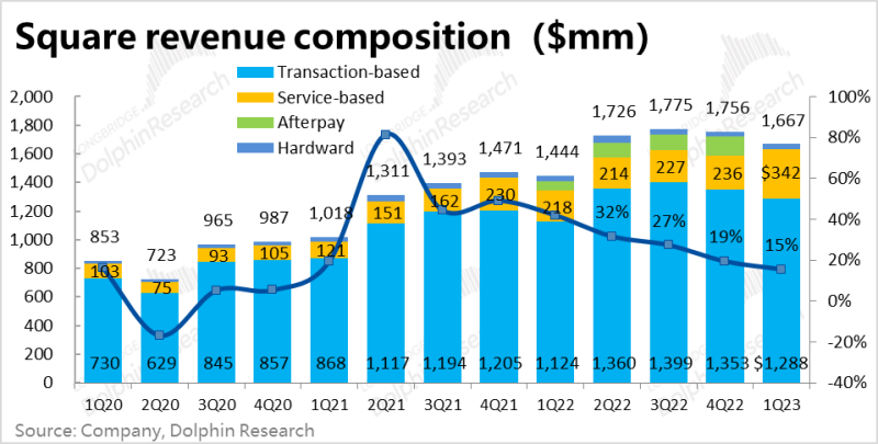 1、交易手续费本季收入约12.9亿美元,同比增长15%,由于去年基数低,增速环比上季还提升了3pct。由于并表Afterpay的收入计入的是服务收入,对交易收入没有影响,因此可以视作剔除Afterpay影响后Square原本业务的自然实际增长情况。