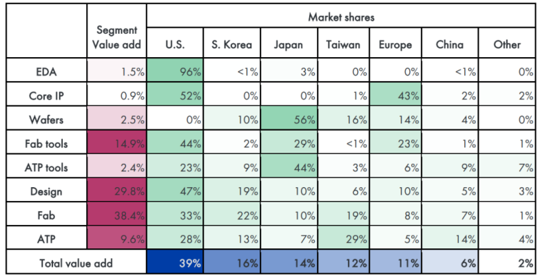 如上图所示,这是当前按领域分类的全球半导体市场格局,大家可以看到在整个芯片产业链,美国拿下了39%的份额,真正的遥遥领先。