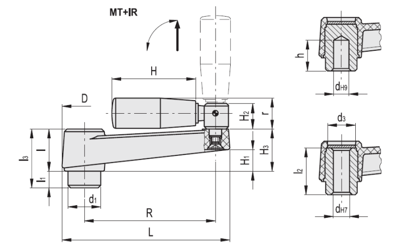 三个标准型号:MT.带旋转手柄。黑色氧化钢毂, H9盲孔或H7铰制通孔。MT-AS带旋转手柄。黑色氧化处理钢毂, H9方形通孔。MT.50-AS H9方形通孔带黄铜加固嵌件。MT+IR带折叠手柄。黑色氧化钢毂, H9盲孔或H7铰制通孔。