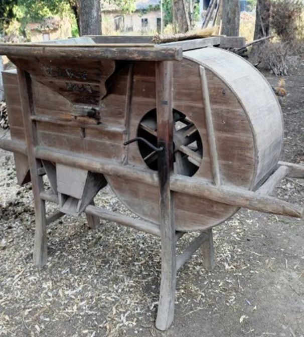 风谷车是用人力转动风轮、让空气流动产生风力,用途是除去粮食中的糠壳、瘪粒、秸屑及其他杂质。