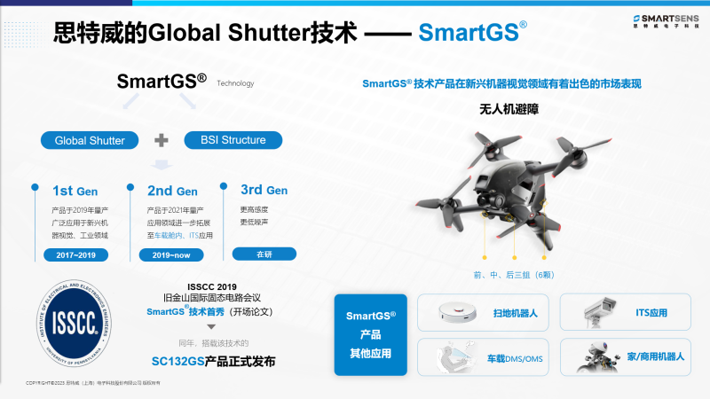 次年,思特威SmartGS®技术的相关论文被ISSCC 2019收录并在图像传感器技术领域报告会上作为重量级的开场论文发表。2020年,第二代SmartGS®技术很快亮相,产品从分辨率到性能都大幅提升,应用领域也进一步拓展至智能车载舱内及ITS应用,而这代产品也是国内企业在大尺寸及大分辨率Global Shutter芯片领域的一次成功破圈,同年思特威成为新兴机器视觉领域全局快门传感器出货量全球领先的企业。