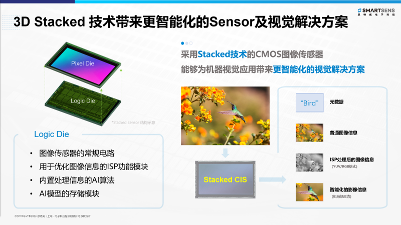着眼未来的机器视觉图像传感器趋势,金方其先生表示,“成像性能对机器视觉及人工智能的发展有着重要的意义,以图像信息为基础而实现的识别、距离判断、筛检、避障、精细化制造等应用的升级都将为各行业数智化转型带来巨大推动力。而基于Sensor端的智能化发展也将带来更多的想象空间,在作为信息采集‘端’的图像传感器上基于3D Stacked技术集成人工智能算法的运行模块,将会为机器视觉应用带来更智能且多元化的发展路径。”