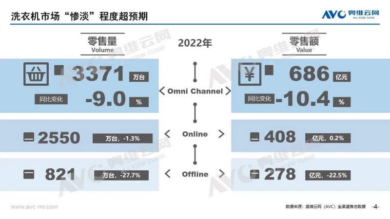 奥维云网数据显示,2022年,中国洗衣机市场全渠道零售量为3371万台,同比下降9%;零售额为686亿元,同比下降10.4%;洗烘一体机线上市场零售额占比同比下降1.4个百分点,零售量占比同比增长0.6个百分点;线下市场零售额占比同比下降3个百分点,零售量占比同比下降1.4个百分点。