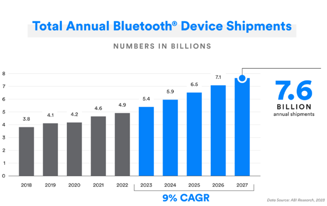 蓝牙技术联盟预测:“蓝牙设备出货量稳定上升,预计到 2027 年将达 76 亿件,年均复合成长率为 9%。”