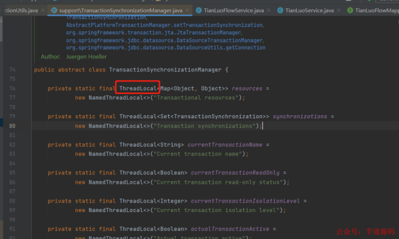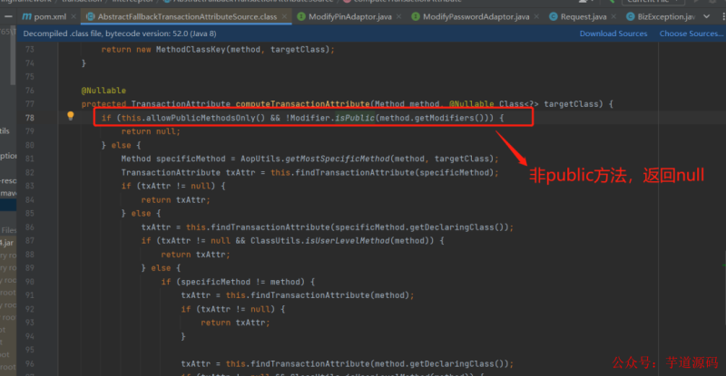 事务不生效的原因 :spring事务方法addTianLuo的访问权限不是public,所以事务就不生效啦,因为Spring事务是由AOP机制实现的,AOP机制的本质就是动态代理,而代理的事务方法不是public的话,computeTransactionAttribute()就会返回null,也就是这时事务属性不存在了。大家可以看下AbstractFallbackTransactionAttributeSource的源码:
