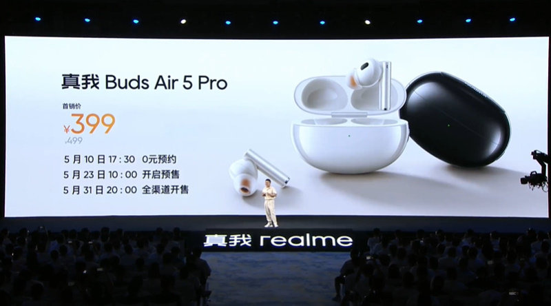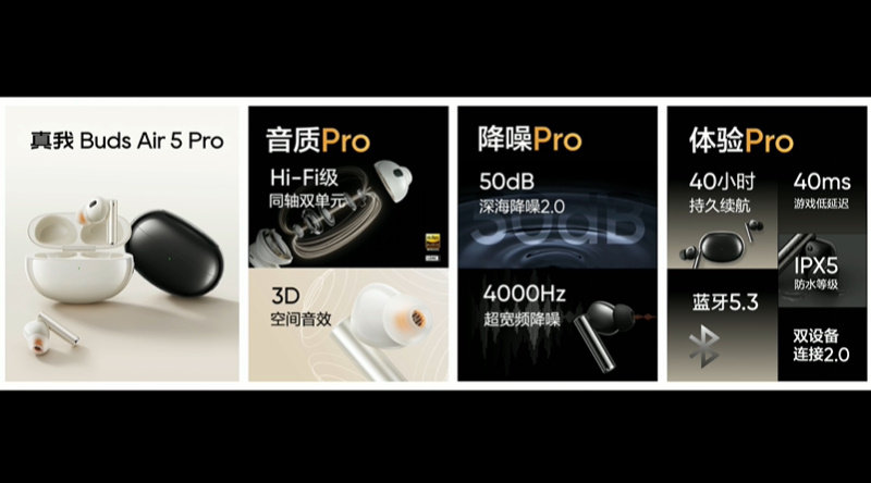 除了卷手机以外,真我还带来了一款卷千元价位的耳机——真我Buds Air 5 Pro真无线耳机,采用了Hi-Fi级同轴双单元,LDAC高清无线传输协议,降噪深度可以达到50dB,采用了4000Hz超宽频降噪技术以及六麦AI深度通话降噪,续航时间可达40小时,充电10分钟听歌7小时,IPX5防水等级。真我Buds Air 5 Pro首销价399元,不过需等到5月31日才正式开售。