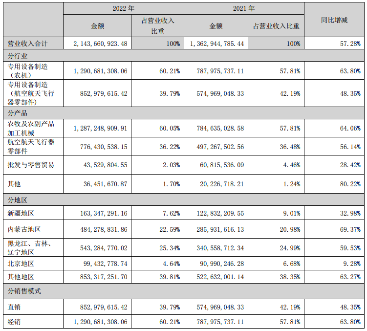 2022年度,公司继续以农机+航空航天的双业务为主营核心体系,持续推进各板块的业务发展,2022年航空航天板块实现营业收入85,297.96万元,同比增长48.35%,亏损较2021年大幅减少,农机板块2022年实现营业收入132,796.11万元,净利润23,363.31万元,均为农机业务历史最好水平。