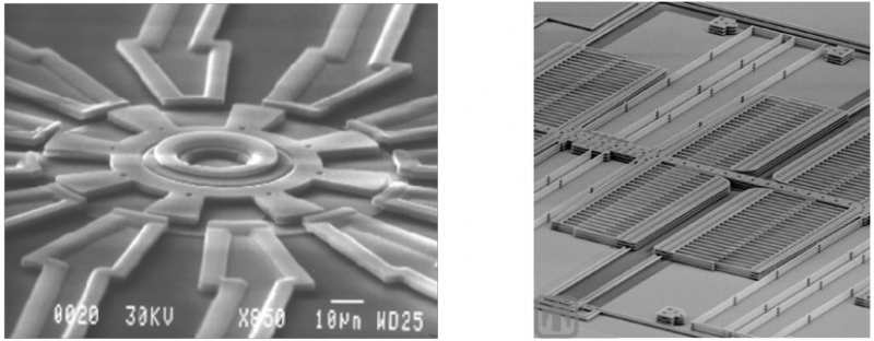 (左)第一台旋转式静电侧驱动电机,(右)侧梳驱动