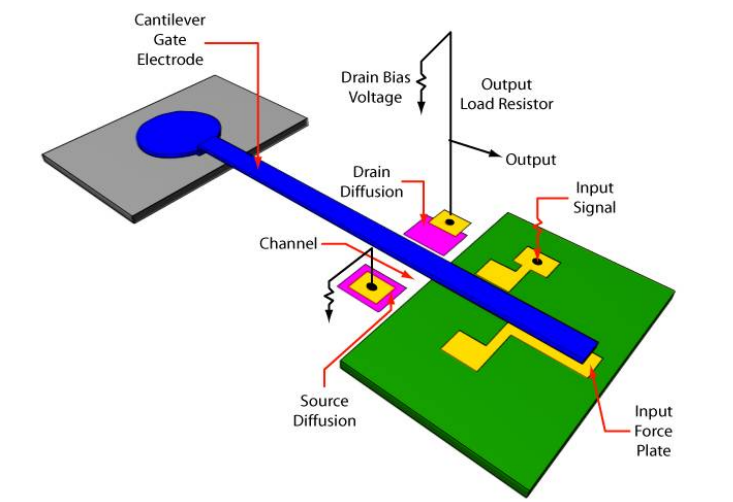 RGT与传统的晶体管不同,它不是固定在栅极氧化层上的。相反,它是可移动的,并且相对于基片是悬臂式的。静电吸引力控制了栅极和基片之间的距离。RGT是最早的微静电致动器示例。它也是表面微加工技术的第一次演示。