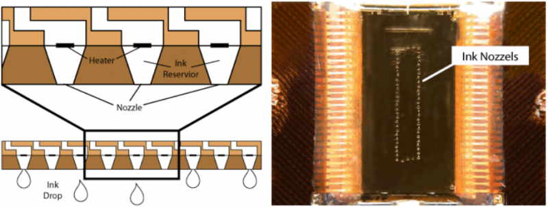 (左)喷墨喷嘴阵列示意图(右)商用喷墨打印机喷头特写图