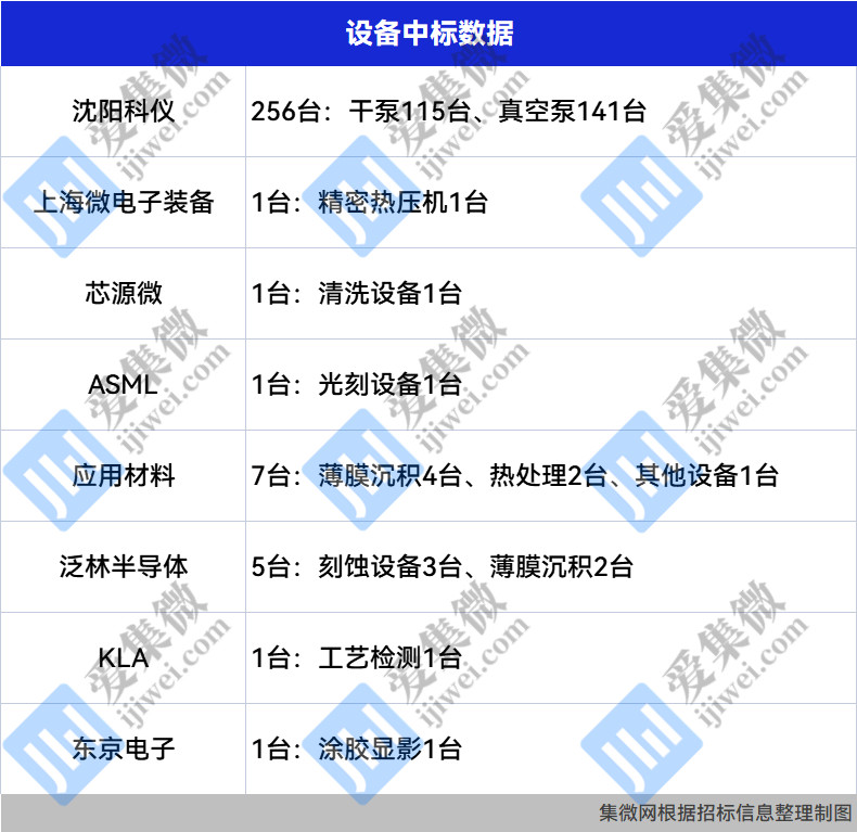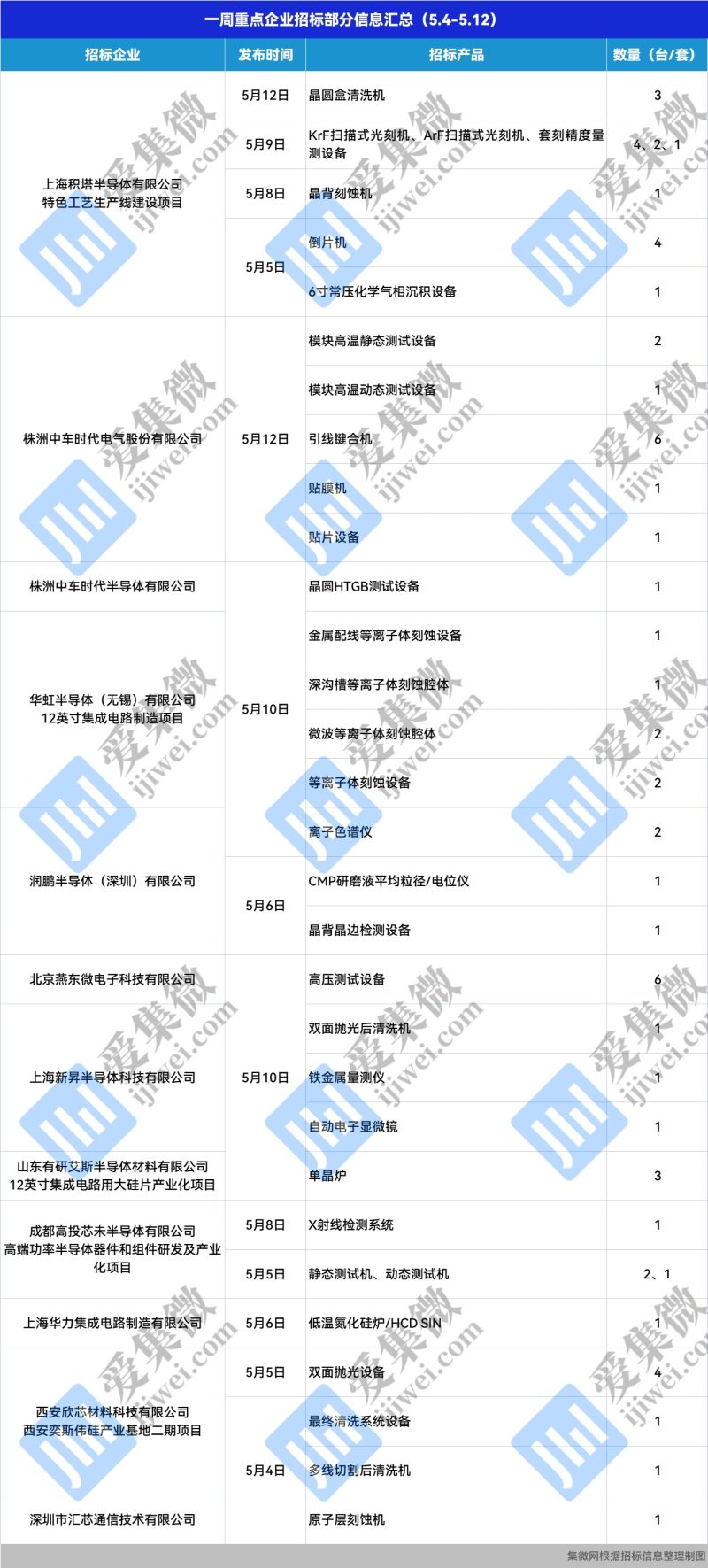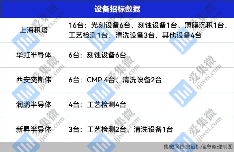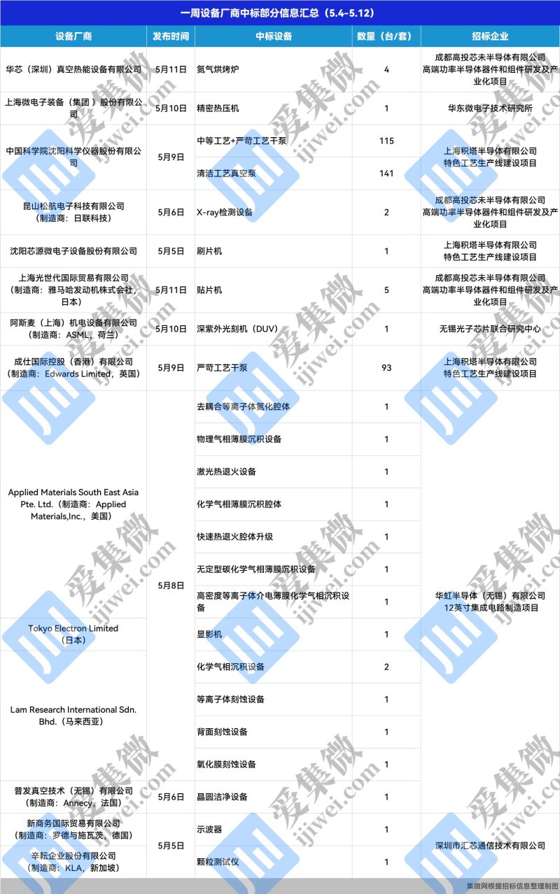 集微网消息,本周,上海积塔新增设备招标16台,华虹半导体新增设备招标6台,西安奕斯伟新增设备招标6台,润鹏半导体新增设备招标4台,新昇半导体新增设备招标3台;沈阳科仪新增中标设备256台,上海微电子装备新增中标设备1台,芯源微新增中标设备1台,ASML新增中标设备1台,应用材料新增中标设备7台,泛林半导体新增中标设备5台,KLA新增中标设备1台,东京电子新增中标设备1台。