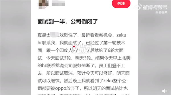 5月12日,上海一位网友称面试到一半公司宣布倒闭了。公司规模还不小,是OPPO旗下的ZEKU芯片子公司。