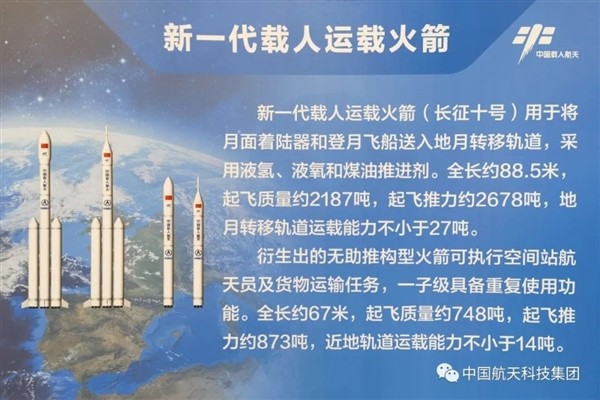 据官方资料,长征十号载人火箭将用于将月面着陆器、登月飞船送入地月转移轨道,液氧液氢煤油推进剂,全长约88.5米,起飞质量约2187吨,起飞推力约2678吨,地月转移轨道运载能力不低于27吨。