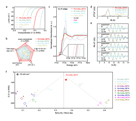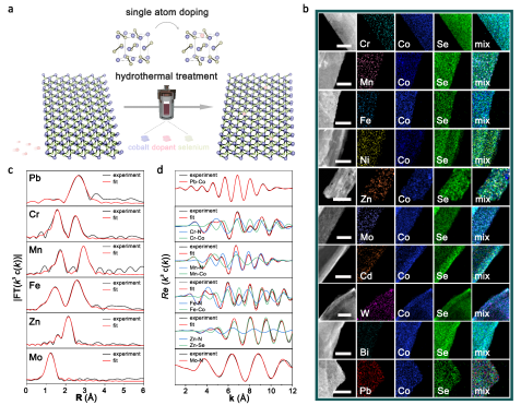 图1. 单原子掺杂的CoSe2-DETA纳米带产物表征。a,十种单原子掺杂合成方法示意图。b,产物的扫描透射电子显微镜元素分布图。c,d,Pb、Cr、Mn、Fe、Zn、Mo掺杂元素扩展X射线吸收精细结构谱的R空间(c)和k空间(d)。