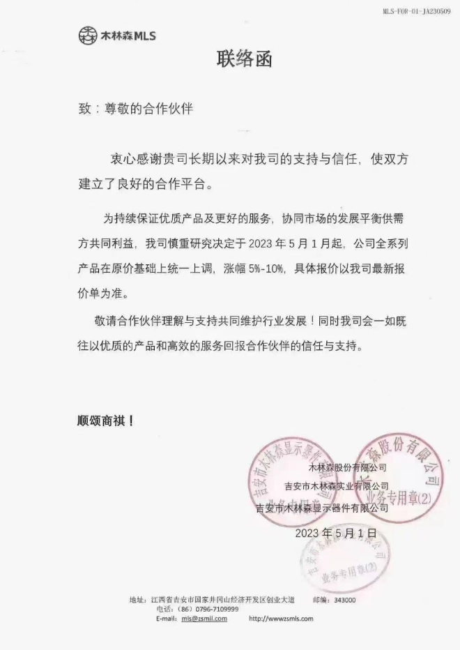 5月1日,木林森发布联络函称,为持续保证优质产品及更好的服务,协同市场的发展平衡供需方共同利益。木林森经慎重研究决定于从2023年5月1日起,公司全系列产品在原价基础上统一上调,涨幅为5-10%,且报价以公司最新报价单为准。